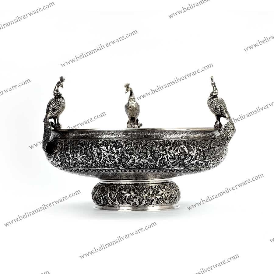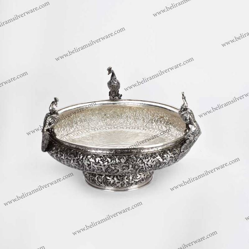 Our Intricate Nakshi Silver Urli With Perched Peacocks centrepiece is artistic, complex and comprehensive cutwork of craftsmanship which makes it an independent centrepiece to grab all the attention in the room to its finely minute details and is an ideal gift if you are someone who believes in giving ordinary gifts a touch of sophistication like us! The Urli is not only perfect for a utility of its own but is also an extravagant centrepiece to grace the get-to-gather events. It is quite possibly the most pursued gift, this bowl gets the appreciation of everybody that looks at it.