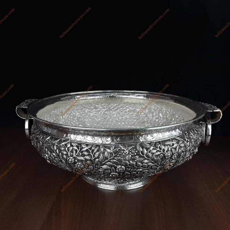 Discover the Leaves Nakshi Silver Urli, a Vastu masterpiece reflecting Beliram Silverware’s artistry. Adorned with intricate floral etchings, it blends vintage charm with modern design.