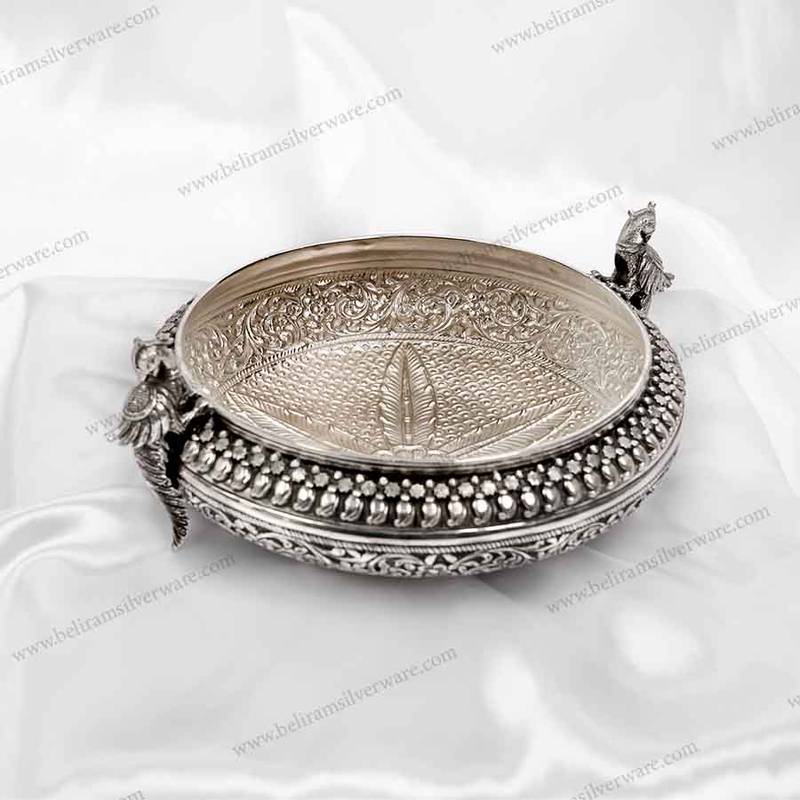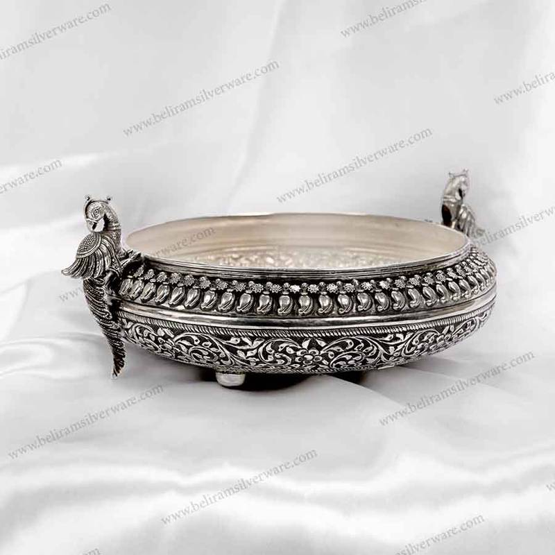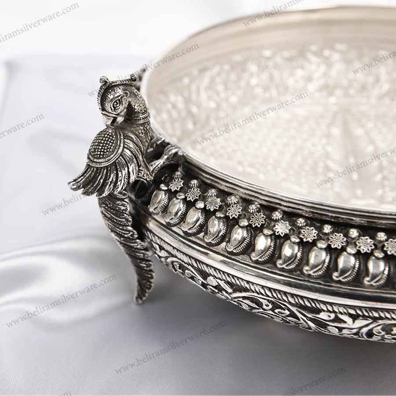 The Perched Peacock Nakshi Design Silver Urli seamlessly transitions from being an ornamental piece to a functional one. It finds its place in your temple. Where you can fill it with water and embellish it with flowers, candles, and diyas to create a divine ambience. Beyond its decorative potential. This Urli serves as an elegant serving vessel, perfect for presenting dry treats, candies, and dried fruits.