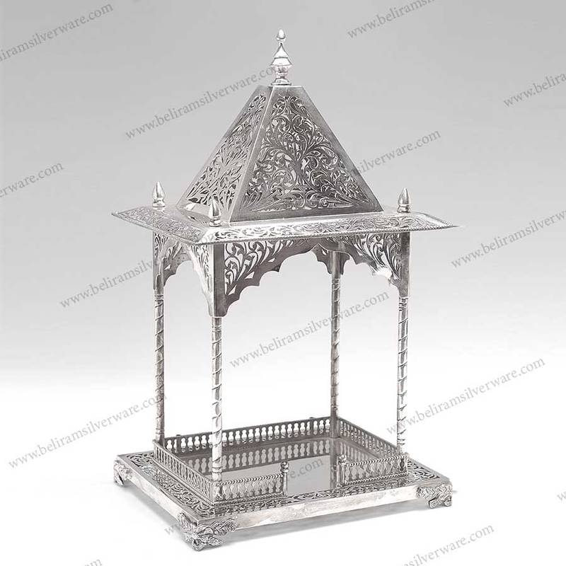 This five star Intricately Carved Silver Mandir is an optimal gift with flawless looks, plan, shape and allure. It will look sensational in your worshipping room as a state of union. It also serve remarkable reverential energies now and again on festive occasions of merriments. This silver mandir is made without accuracy and astonishing silver material. The Mandir is spacious enough to place an idol, a diya or just decorate it with flowers to add to your pooja ghar. Additionally, it also spots a cornered fence to elevate its design.