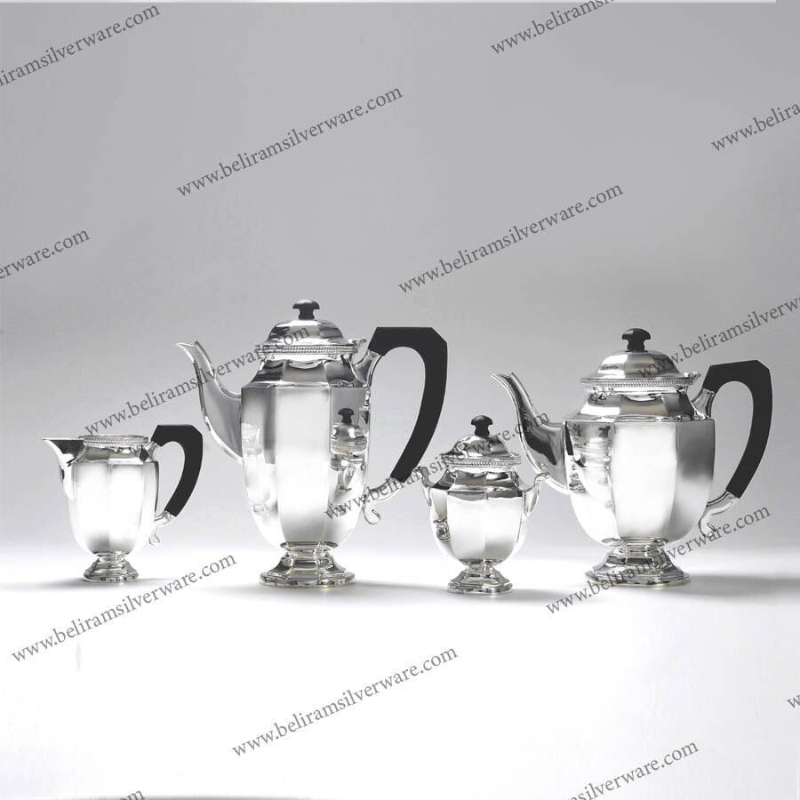 The Hexagonal Modern Silver Tea Set stands as a pinnacle of craftsmanship and design. It is an exceptional addition to your collection. This sterling silver tea set embraces the contemporary while respecting the traditions of tea culture, offering a blend of beauty and utility.
