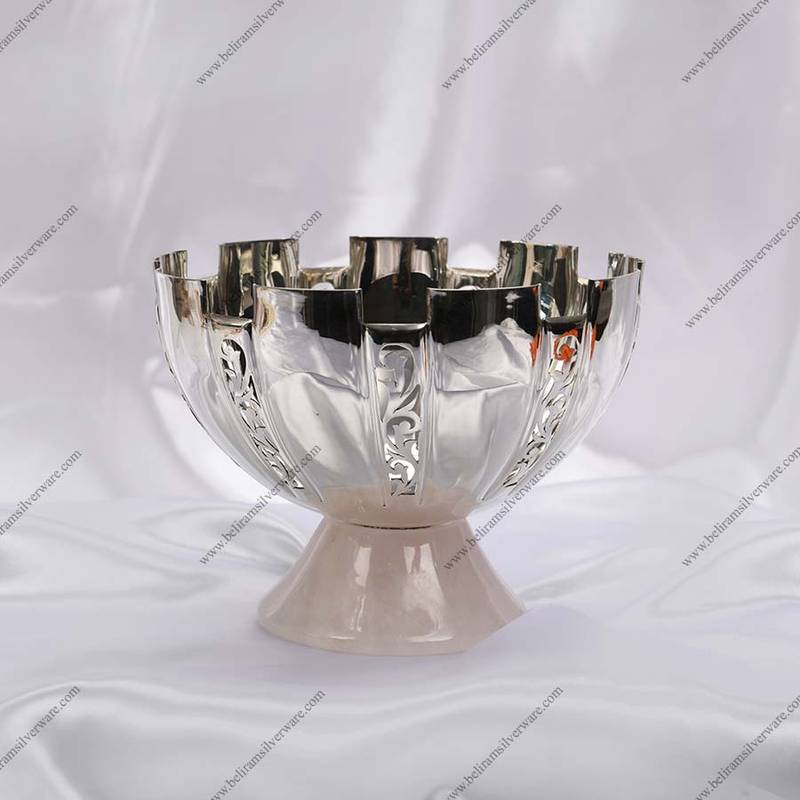Grace your home with beautiful pieces from Beliram and curate a rich and royal vibe. This Cutwork Motif Silver Bowl is a unique piece that is bound to elevate the aura of your home. The bowl has alternate panels featuring cutwork designs and a cut-out rim that makes it stand out from other generic bowls. To act like the cherry on the cake, the bowl is elevated on a quartz pedestal. The pedestal has a broad fluted texture with a broad base that provides the required stability to the bowl.