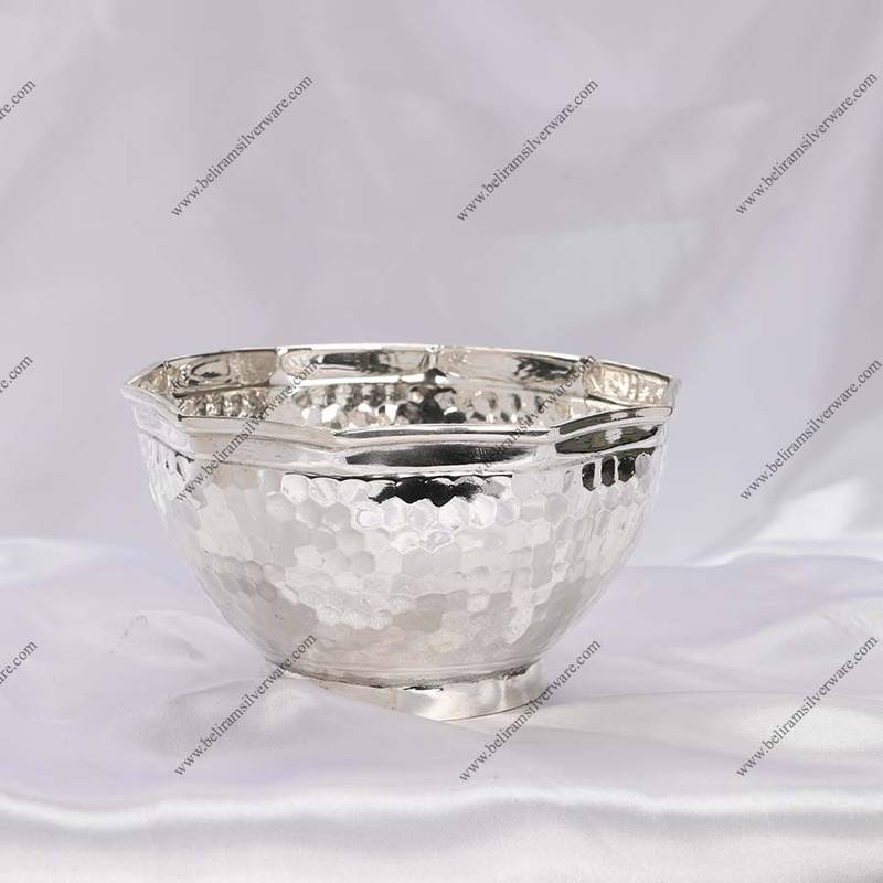 Buy this Polygon Edged Hammered Silver Bowl from Beliram for your home or to gift and spread happiness everywhere. The sterling silver small bowl has a hammered texture to make it unique from other bowls and features a polygon-shaped rim. It is placed on a circular platform that gives it some height.