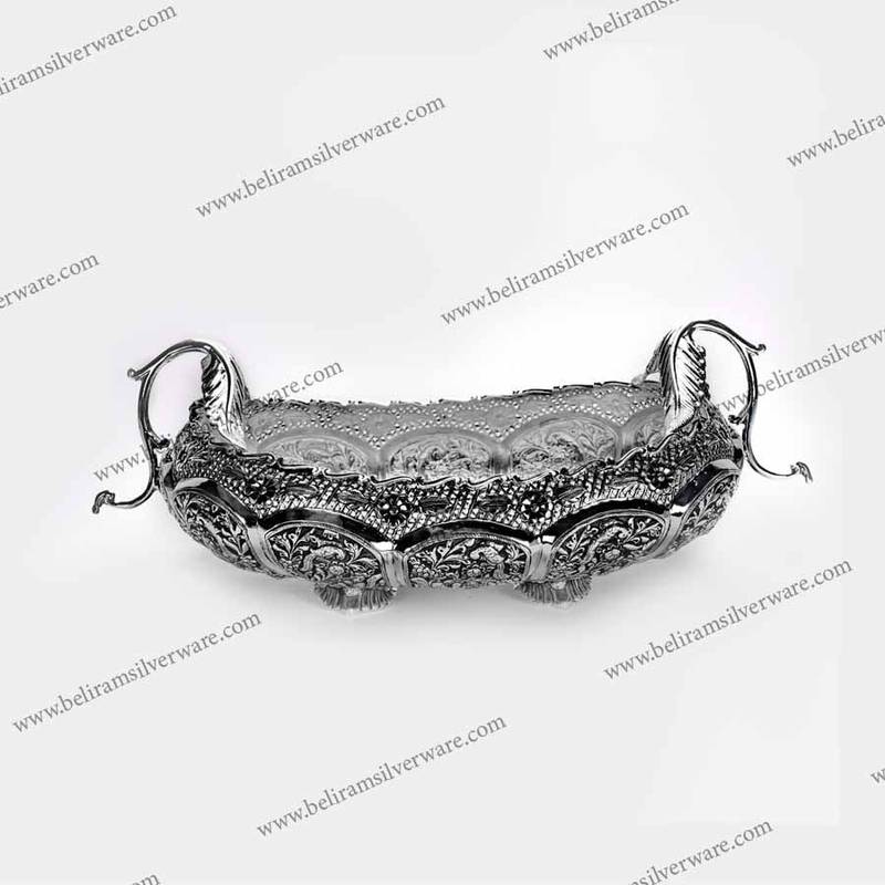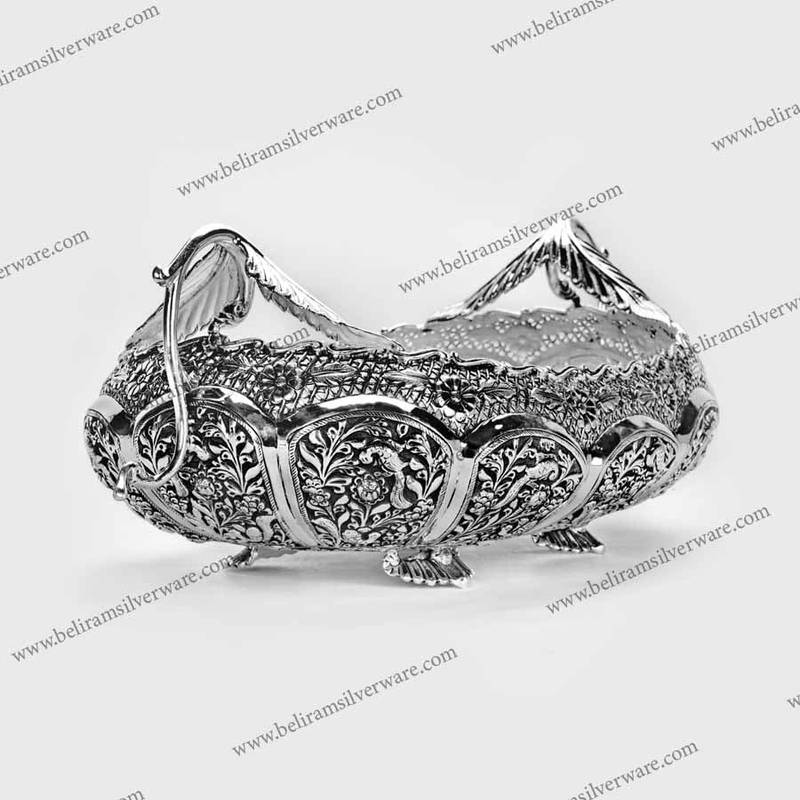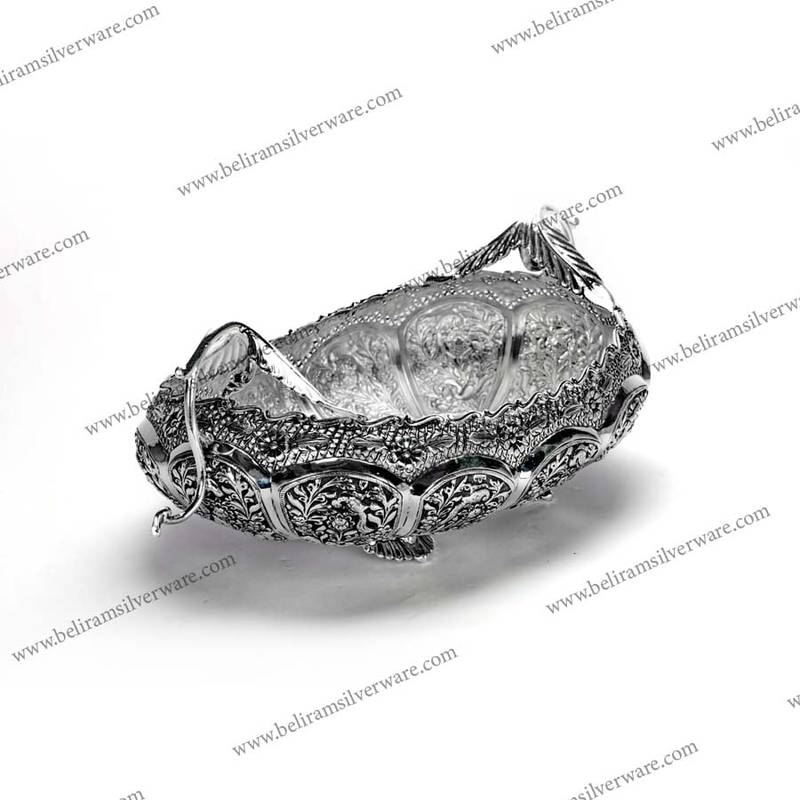 Our online portal features a plush selection of pure silver centerpieces with engravings and nakshi work. Buy this Leaf Handle Nakshi Silver Bowl Centerpiece now.
