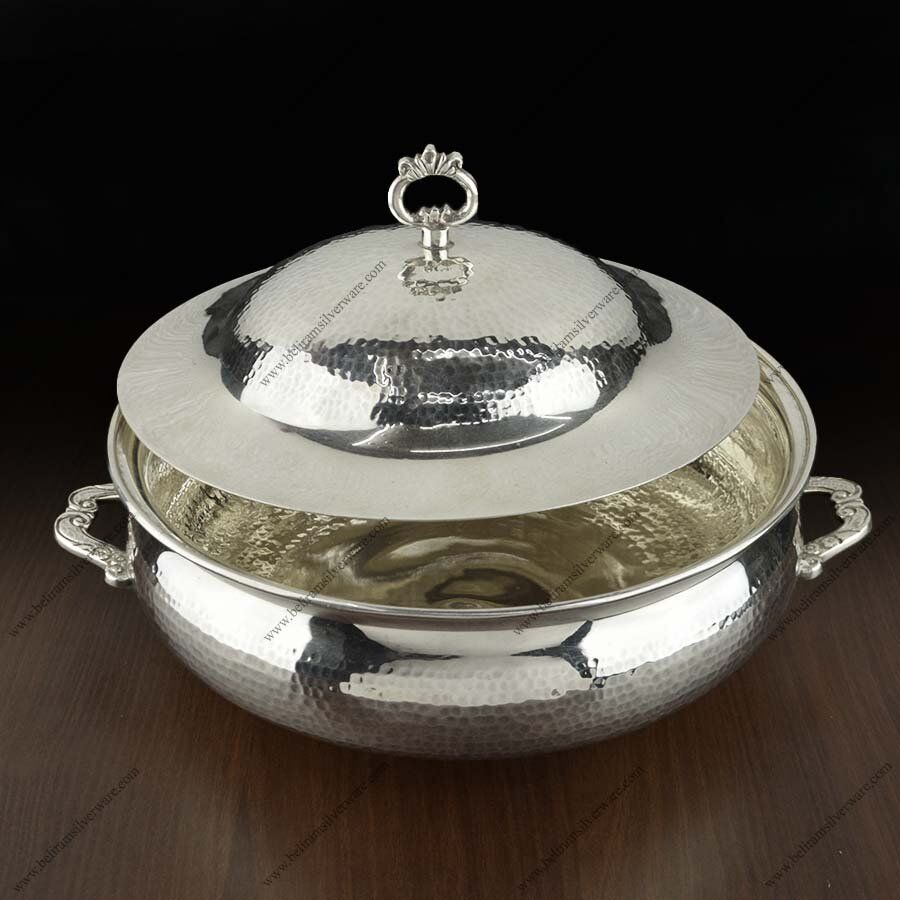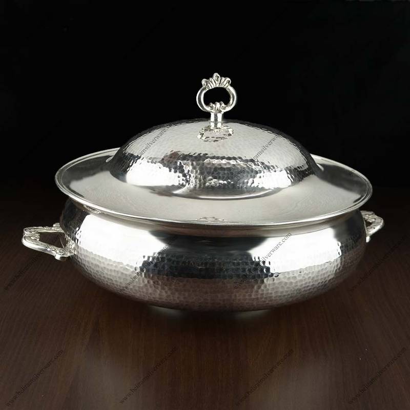 Beliram’s Dot Hammered Silver Dish is the ideal silver dinner ware for every home since it bestows an unmatched imperial appearance. The Handi’s dome-shaped body, which displays a spectacular design, is supported by a spreading pedestal foot. A comparable lid with a dome form covers the alluring work of art.