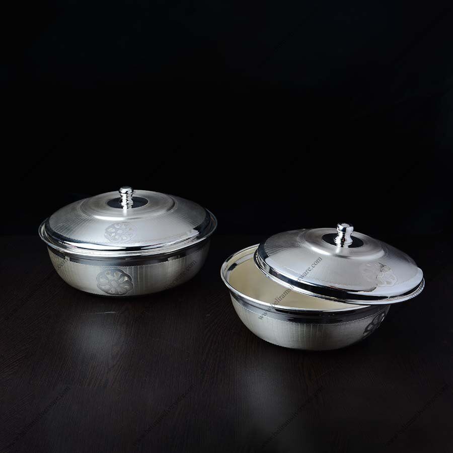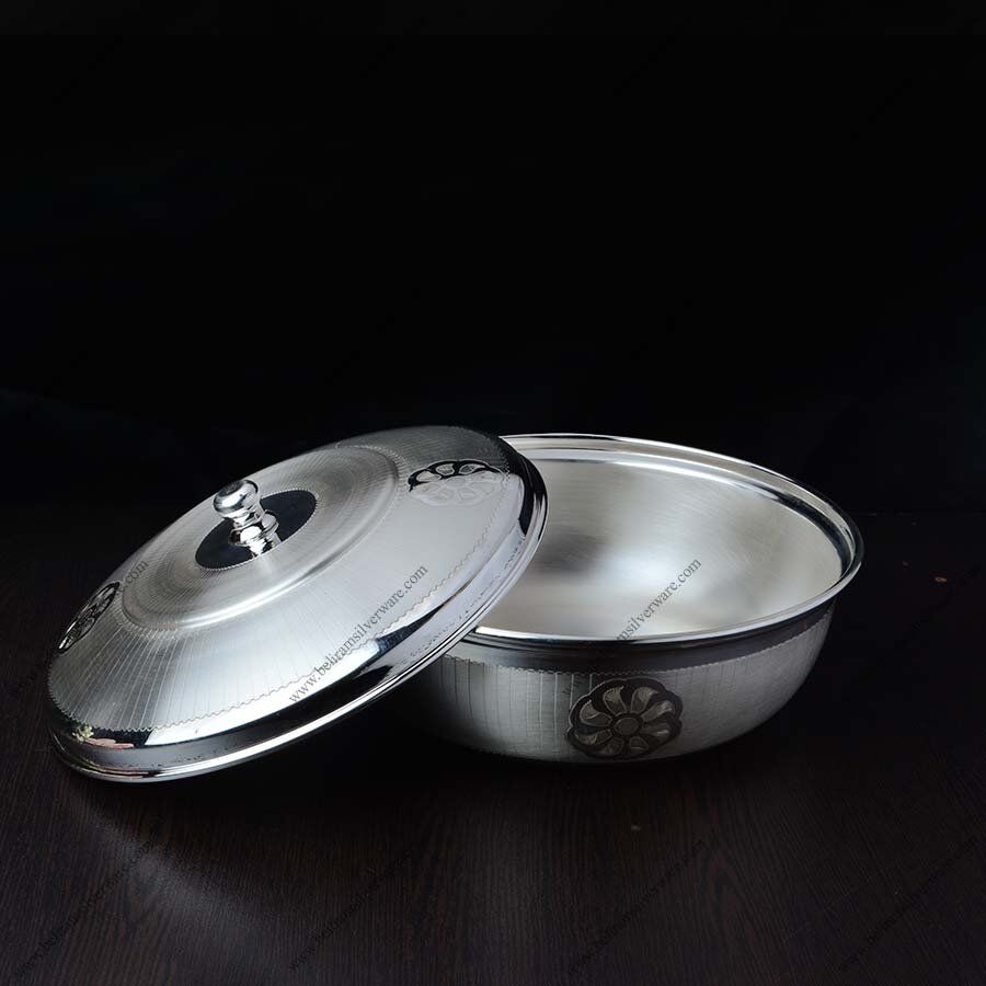It has been scientifically proven that our sight influences the way we experience food to a great extent. Which is why it is extremely important to present the food in the most graceful manner possible. The Flower Motif Dull Polish Silver Dish Set makes sure that your guests admire the presentation of the food it retains. Along with the mattified, dull polish on the outer bodies of the bowls and lids, the floral detailings etched on them add the finishing touches to its glory.