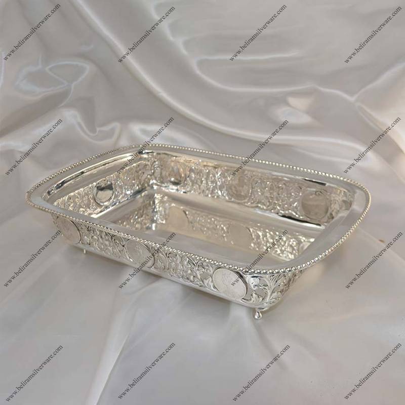 The rim of the dish is adorned with beaded ornaments, intensifying the imperiality of the piece of art. Each edge of the silver dining ware is secured with a foot, collectively resting on four feet. Being a multi-functional silver dining ware, the dish has enough space to store an array of things from dry fruits to sweet dishes. This stellar art piece steals the thunder of any other dinnerware in and around the kitchen.